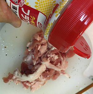 豚肉には塩コショウで味を付け、小麦粉をまぶしておきます。