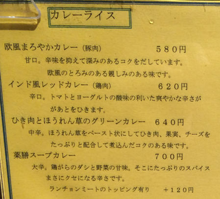 今度は欧風とレッドに加え、グリーンカレーによる三位一体攻撃であります。ライスも多めですが 3種類を順に味わっているとアッという間に完食でした。
