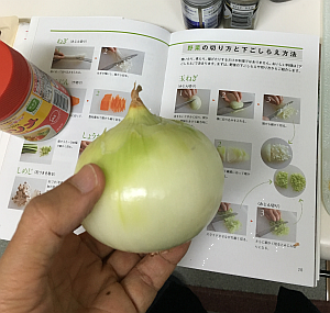 『料理ができる男は無敵である』のレシピによると、まずは「玉ねぎをみじん切り」。「野菜の切り方と下ごしらえ方法(p.210)」を参考にしました。