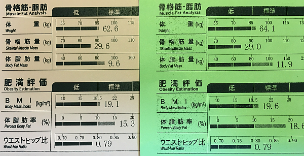 左が 3月29日、右が今回(7/5)。約 3ヶ月で体重 1.5kg、さらに体脂肪量 2.3kg の増加は目立ちます。