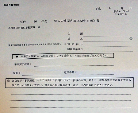 同封されていた「個人の事業内容に関する回答書」の最初に