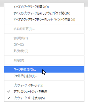 - ブックマークバーを右クリックして「ページを追加」を選択