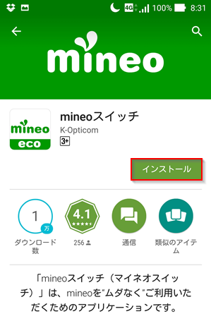「Google Play」の「アプリ」で「mineo」と検索すると「mineoスイッチ」が見つかります。
