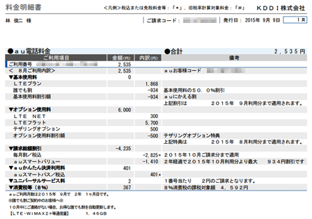 先月(2015年8月)の「au電話料金」は 2,535円 でした。