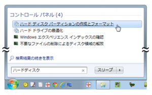 Windows 7 内部を「ハードディスク」で検索して「ハードディスク パーティションの作成とフォーマット」を選択します。